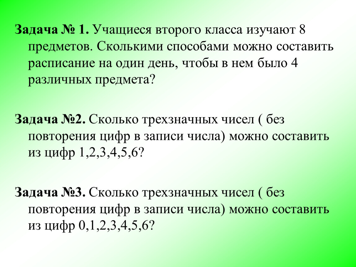 Задача № 1. Учащиеся второго класса изучают 8 предметов. Сколькими способами можно составить расписание на один день, чтобы в нем было 4 различных предмета?