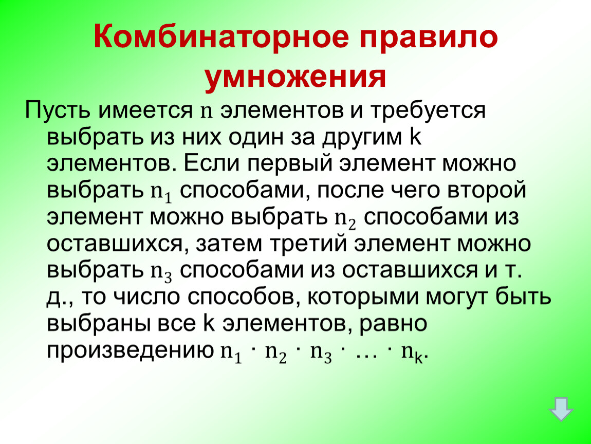 Пусть имеется n элементов и требуется выбрать из них один за другим k элементов. Если первый элемент можно выбрать n1 способами, после чего второй элемент можно выбрать n2 способами из оставшихся, затем третий элемент можно выбрать n3 способами из оставшихся и т. д., то число способов, которыми могут быть выбраны все k элементов, равно произведению n1 · n2 · n3 · … · nk.