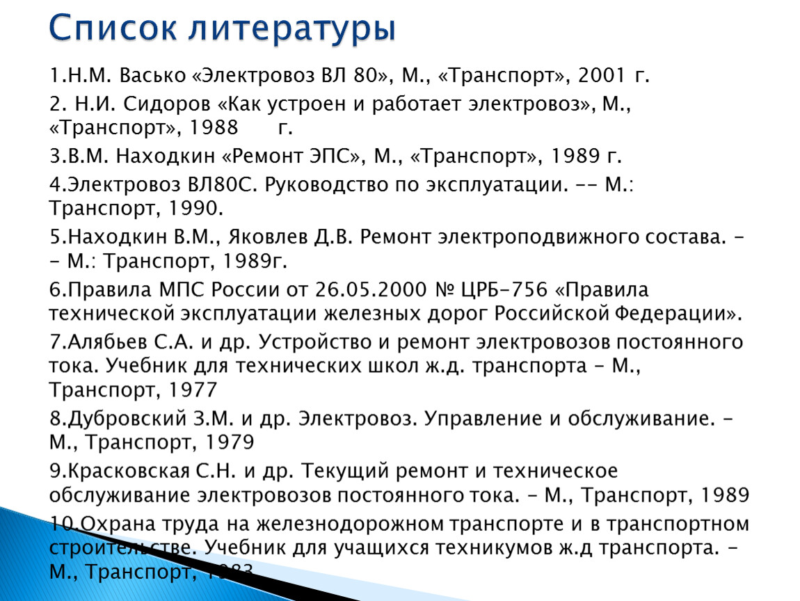 1.Н.М. Васько «Электровоз ВЛ 80», М., «Транспорт», 2001 г.