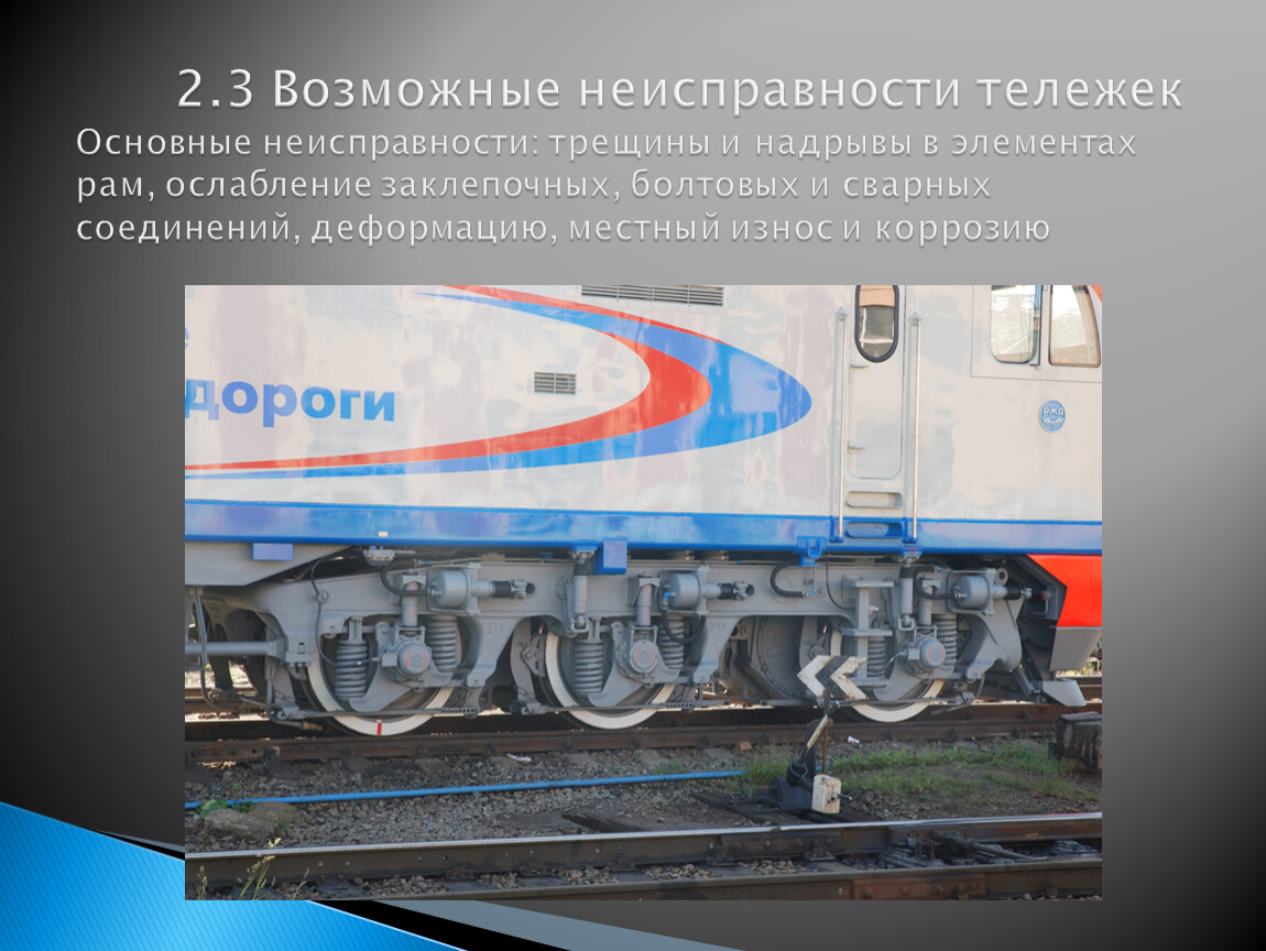 2.3 Возможные неисправности тележекОсновные неисправности: трещины и надрывы в элементах рам, ослабление заклепочных, болтовых и сварных соединений, деформацию, местный износ и коррозию