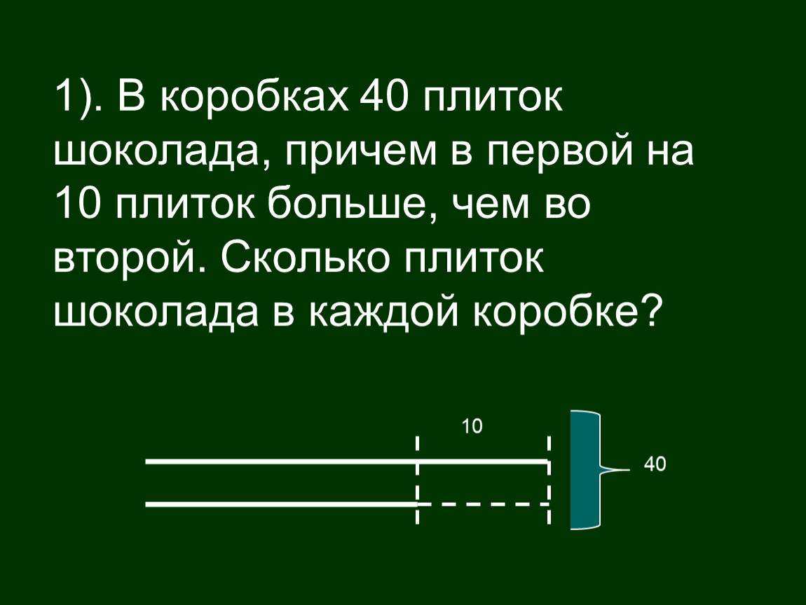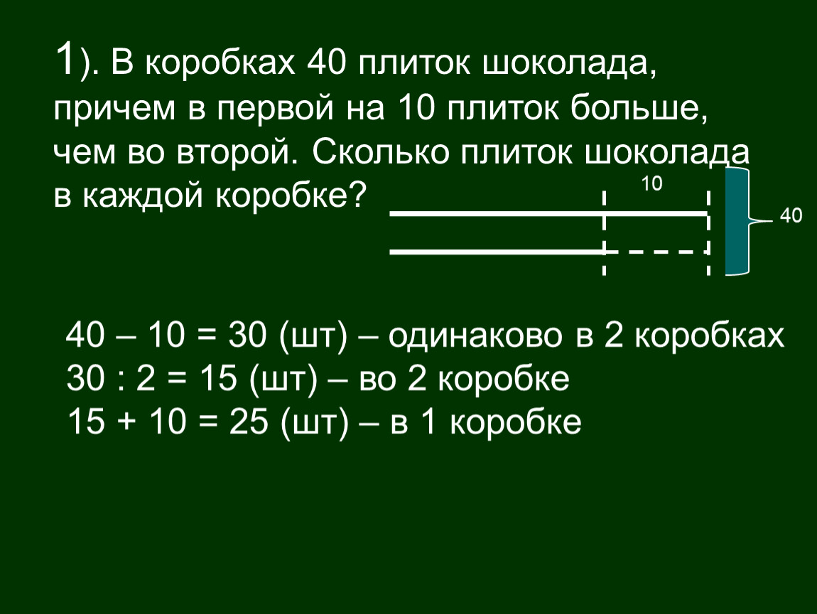 1). В коробках 40 плиток шоколада, причем в первой на 10 плиток больше, чем во второй. Сколько плиток шоколада в каждой коробке?