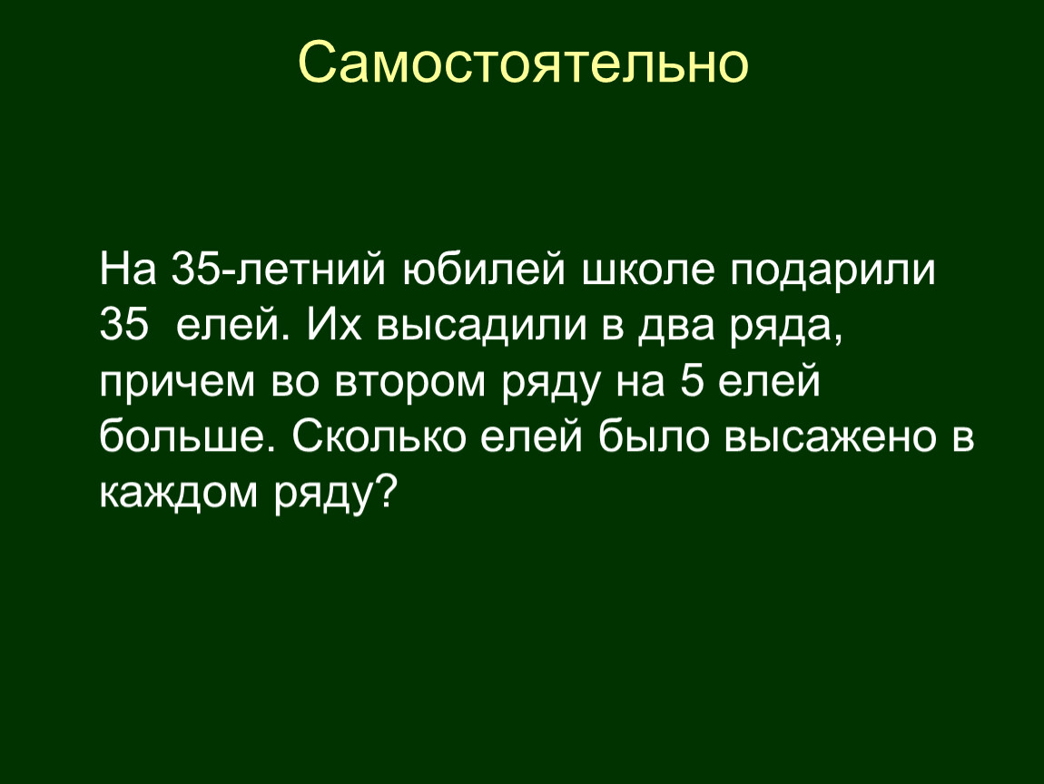 На 35-летний юбилей школе подарили 35 елей. Их высадили в два ряда, причем во втором ряду на 5 елей больше. Сколько елей было высажено в каждом ряду?