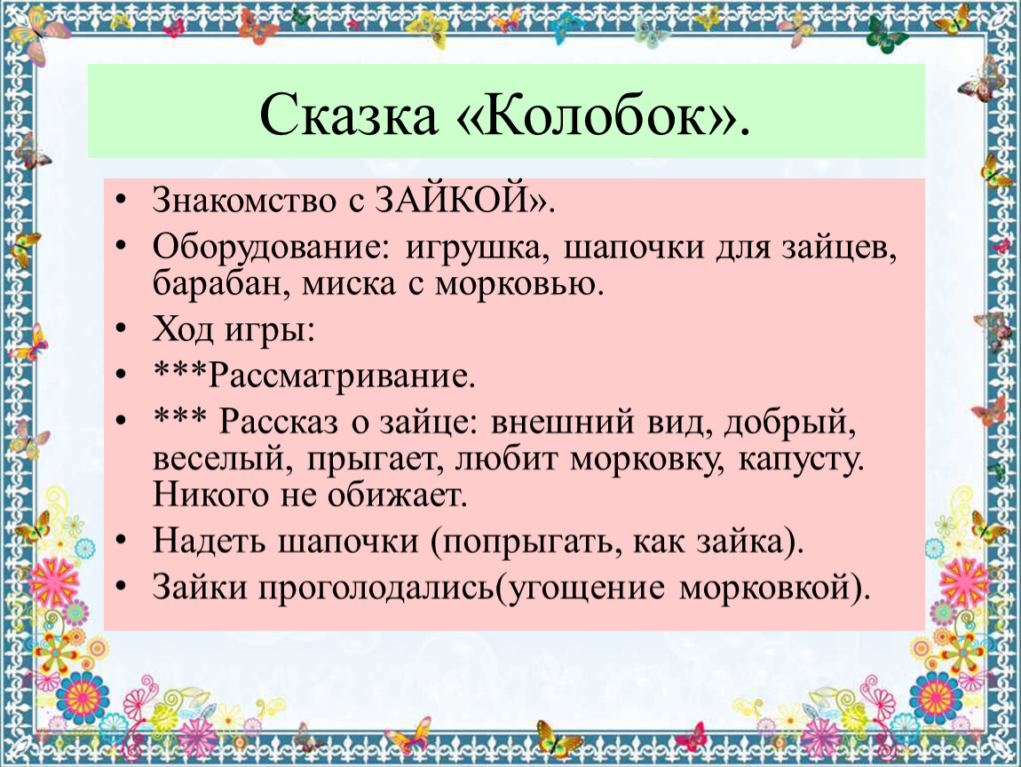 Оборудование: игрушка, шапочки для зайцев, барабан, миска с морковью.