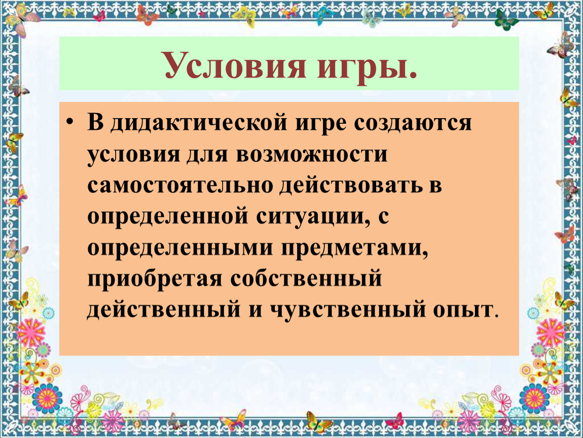 В дидактической игре создаются условия для возможности самостоятельно действовать в определенной ситуации, с определенными предметами, приобретая собственный действенный и чувственный опыт.