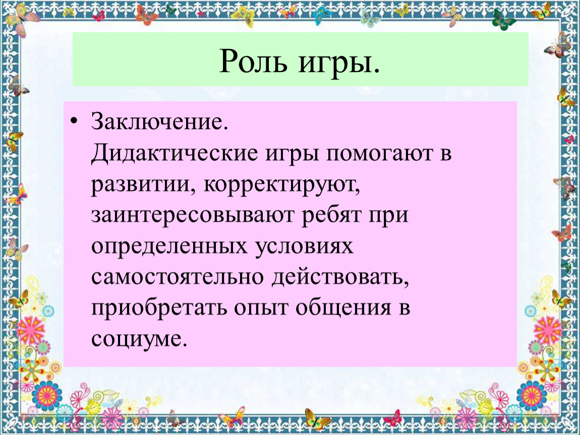 Заключение.Дидактические игры помогают в развитии, корректируют, заинтересовывают ребят при определенных условиях самостоятельно действовать, приобретать опыт общения в социуме.