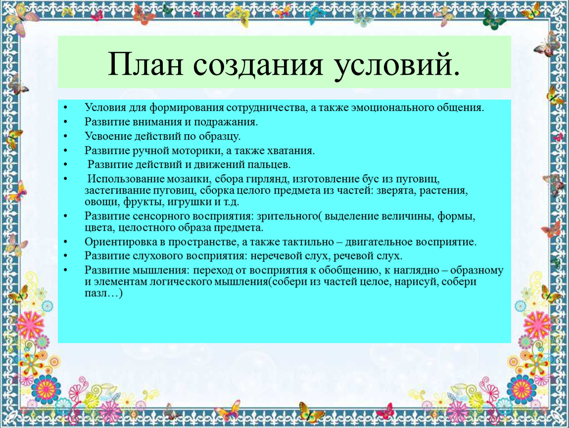 Развитие сенсорного восприятия: зрительного( выделение величины, формы, цвета, целостного образа предмета.