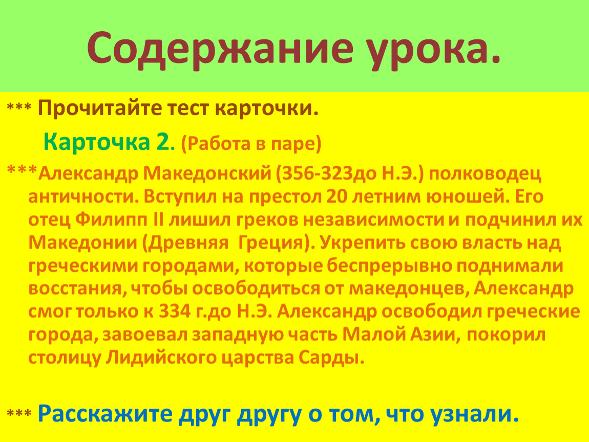***Александр Македонский (356-323до Н.Э.) полководец античности. Вступил на престол 20 летним юношей. Его отец Филипп II лишил греков независимости и подчинил их Македонии (Древняя Греция). Укрепить свою власть над греческими городами, которые беспрерывно поднимали восстания, чтобы освободиться от македонцев, Александр смог только к 334 г.до Н.Э. Александр освободил греческие города, завоевал западную часть Малой Азии, покорил столицу Лидийского царства Сарды.