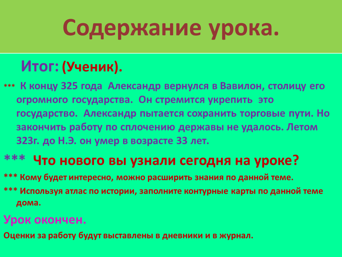 *** К концу 325 года Александр вернулся в Вавилон, столицу его огромного государства. Он стремится укрепить это государство. Александр пытается сохранить торговые пути. Но закончить работу по сплочению державы не удалось. Летом 323г. до Н.Э. он умер в возрасте 33 лет.