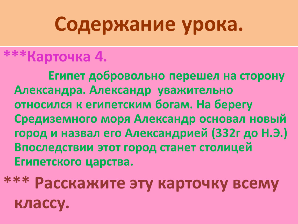 Египет добровольно перешел на сторону Александра. Александр уважительно относился к египетским богам. На берегу Средиземного моря Александр основал новый город и назвал его Александрией (332г до Н.Э.) Впоследствии этот город станет столицей Египетского царства.