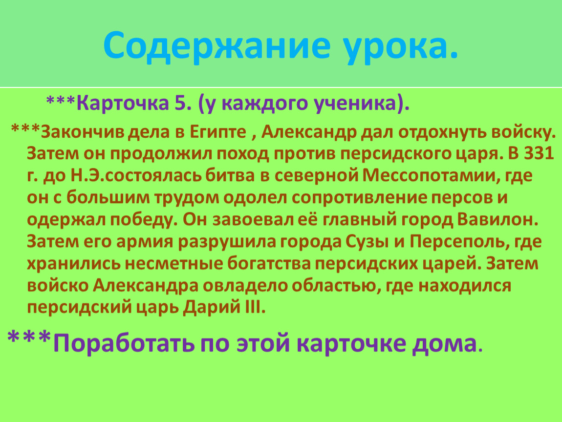 ***Закончив дела в Египте , Александр дал отдохнуть войску. Затем он продолжил поход против персидского царя. В 331 г. до Н.Э.состоялась битва в северной Мессопотамии, где он с большим трудом одолел сопротивление персов и одержал победу. Он завоевал её главный город Вавилон. Затем его армия разрушила города Сузы и Персеполь, где хранились несметные богатства персидских царей. Затем войско Александра овладело областью, где находился персидский царь Дарий III.