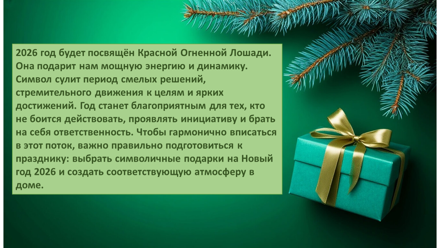 2026 год будет посвящён Красной Огненной Лошади. Она подарит нам мощную энергию и динамику. Символ сулит период смелых решений, стремительного движения к целям и ярких достижений. Год станет благоприятным для тех, кто не боится действовать, проявлять инициативу и брать на себя ответственность. Чтобы гармонично вписаться в этот поток, важно правильно подготовиться к празднику: выбрать символичные подарки на Новый год 2026 и создать соответствующую атмосферу в доме.