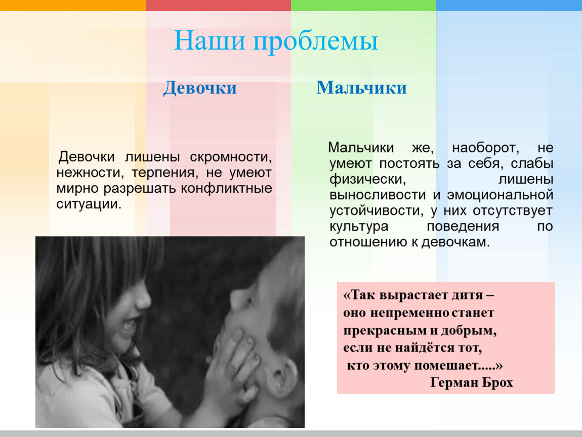 Мальчики же, наоборот, не умеют постоять за себя, слабы физически, лишены выносливости и эмоциональной устойчивости, у них отсутствует культура поведения по отношению к девочкам.