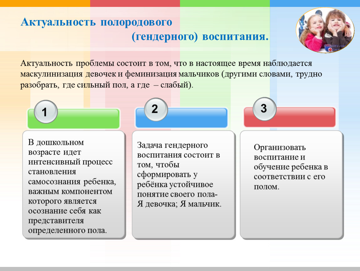 Актуальность полородового (гендерного) воспитания.Актуальность проблемы состоит в том, что в настоящее время наблюдается маскулинизация девочек и феминизация мальчиков (другими словами, трудно разобрать, где сильный пол, а где – слабый).