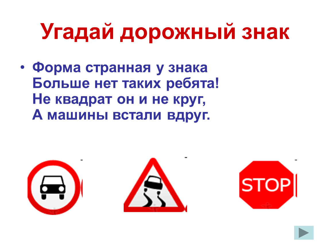 Форма странная у знакаБольше нет таких ребята!Не квадрат он и не круг,А машины встали вдруг.