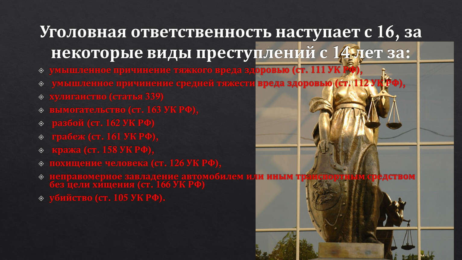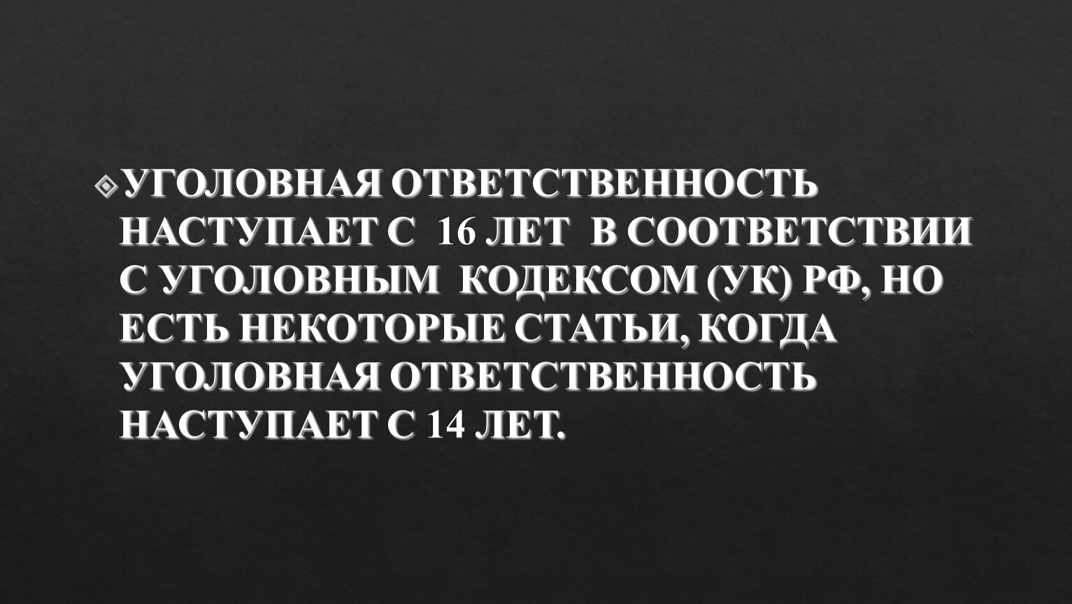 УГОЛОВНАЯ ОТВЕТСТВЕННОСТЬ НАСТУПАЕТ С 16 ЛЕТ В СООТВЕТСТВИИ С УГОЛОВНЫМ КОДЕКСОМ (УК) РФ, НО ЕСТЬ НЕКОТОРЫЕ СТАТЬИ, КОГДА УГОЛОВНАЯ ОТВЕТСТВЕННОСТЬ НАСТУПАЕТ С 14 ЛЕТ.