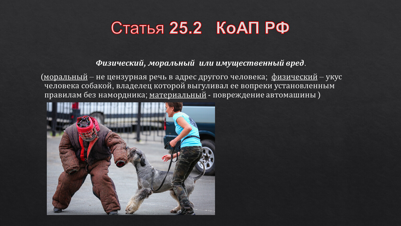 (моральный – не цензурная речь в адрес другого человека; физический – укус человека собакой, владелец которой выгуливал ее вопреки установленным правилам без намордника; материальный - повреждение автомашины )