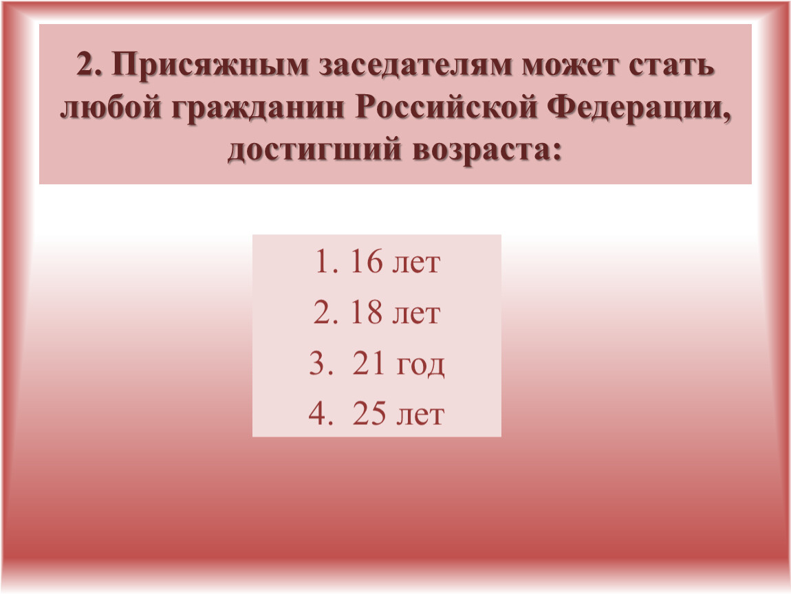 2. Присяжным заседателям может стать любой гражданин Российской Федерации, достигший возраста: