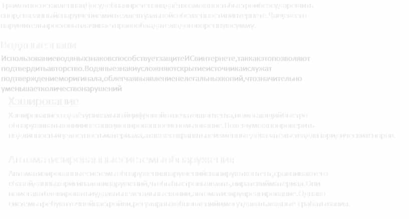 ИспользованиеводяныхзнаковспособствуетзащитеИСвинтернете,таккакэтопозволяют подтвердитьавторство.Водяныезнакиусложняютскрытиеисточникаислужат подтверждениеморигинала,облегчаявыявлениенелегальныхкопий,чтозначительно уменьшаетколичествонарушений