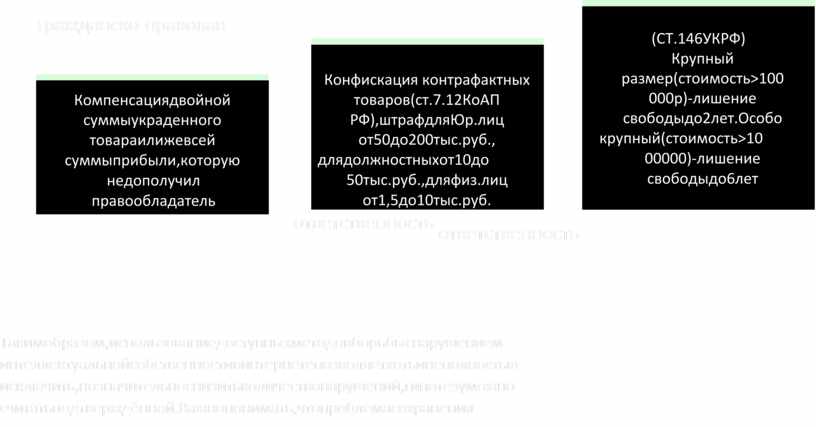 Конфискация контрафактных товаров(ст.7.12КоАП РФ),штрафдляЮр.лиц от50до200тыс.руб., длядолжностныхот10до 50тыс.руб.,дляфиз.лиц от1,5до10тыс.руб. |