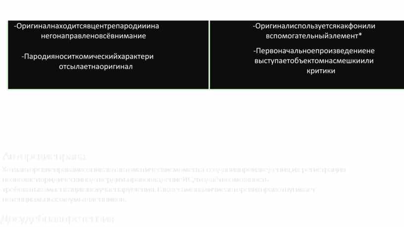 -Оригиналиспользуетсякакфонили вспомогательныйэлемент* -Первоначальноепроизведениене выступаетобъектомнасмешкиили критики |