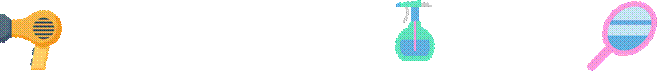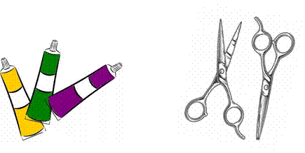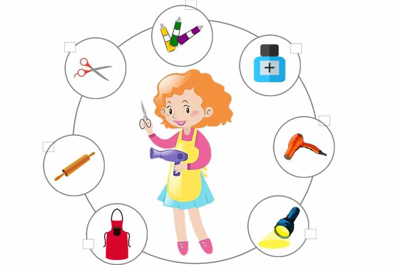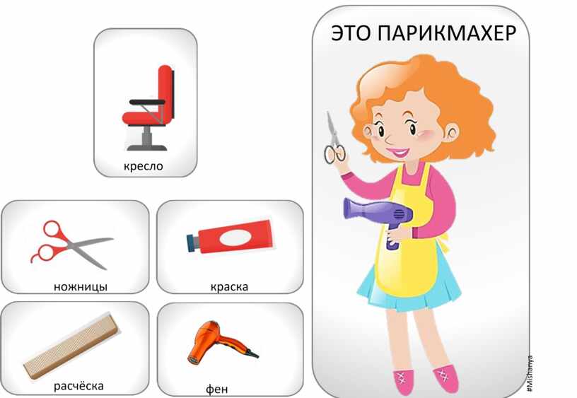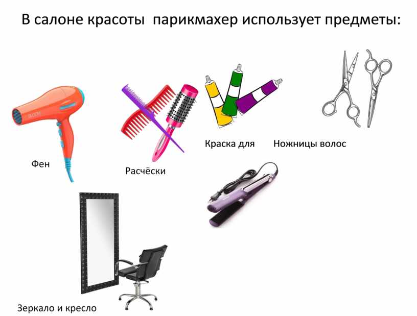 В салоне красоты парикмахер использует предметы: фен, расчёски, зеркало, краску для волос и многое другое.