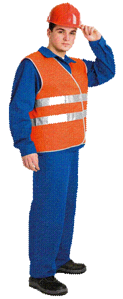 комбинезон, каска, сапоги или ботики, жилет.