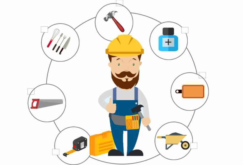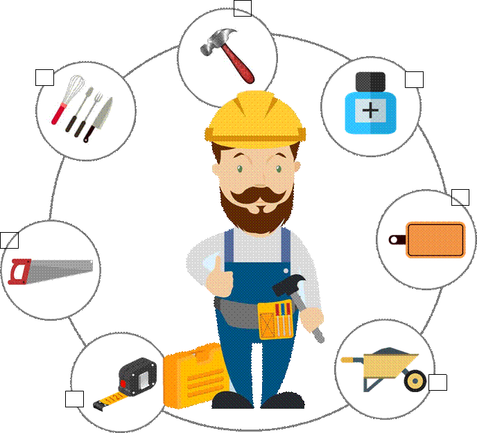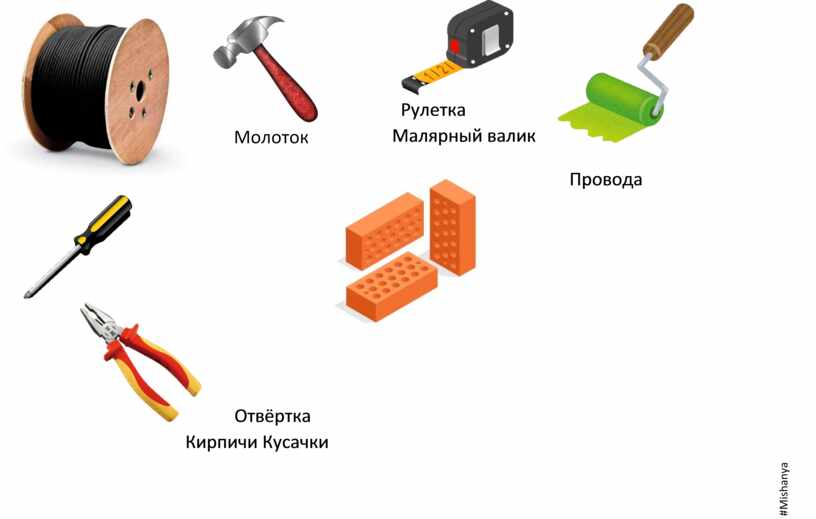На стройке строитель использует предметы: тачка, кусачки, малярный валик, молоток, рулетку и многое другое.