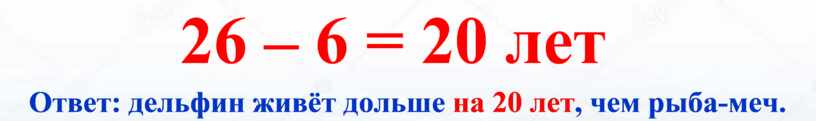 • Рыба-меч живёт 6 лет, а дельфин – 26 лет.