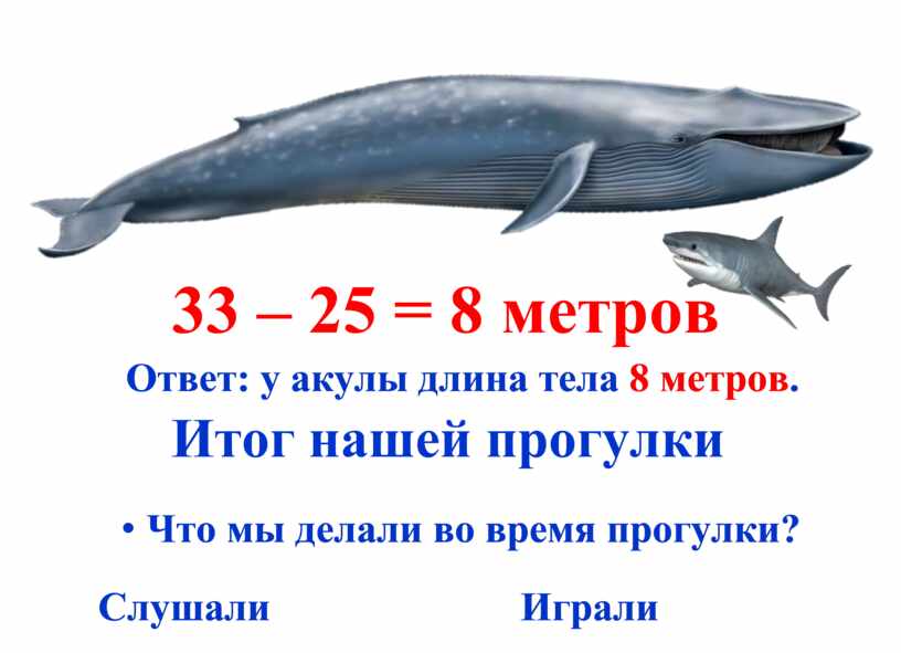 • Кит имеет длину тела 33 метра, а акула на 25 метров меньше, чем кит.