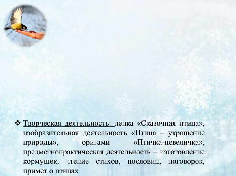 деятельность – изготовление кормушек, чтение стихов, пословиц, поговорок,