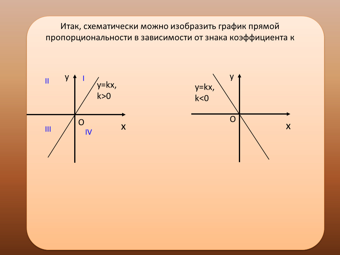 Итак, схематически можно изобразить график прямой пропорциональности в зависимости от знака коэффициента к