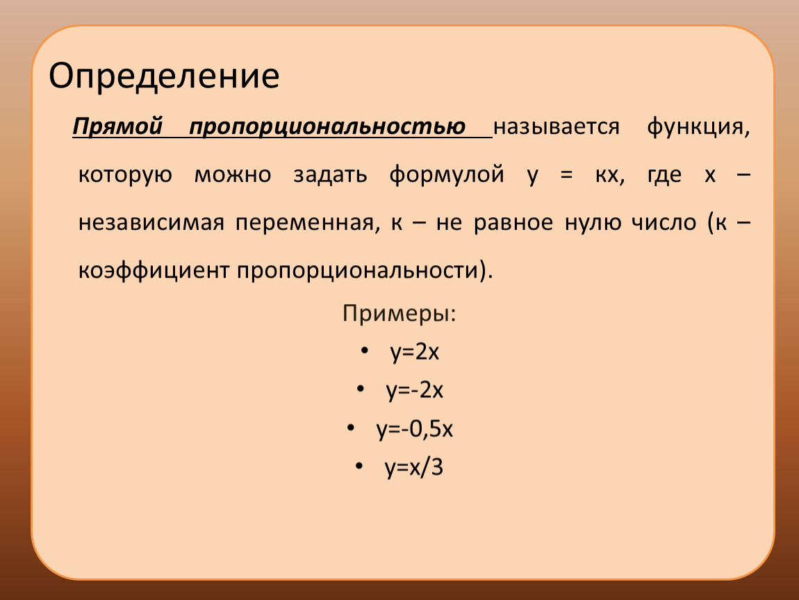 Прямой пропорциональностью называется функция, которую можно задать формулой у = кх, где х – независимая переменная, к – не равное нулю число (к – коэффициент пропорциональности).