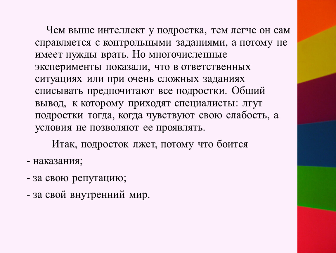 Чем выше интеллект у подростка, тем легче он сам справляется с контрольными заданиями, а потому не имеет нужды врать. Но многочисленные эксперименты показали, что в ответственных ситуациях или при очень сложных заданиях списывать предпочитают все подростки. Общий вывод, к которому приходят специалисты: лгут подростки тогда, когда чувствуют свою слабость, а условия не позволяют ее проявлять.