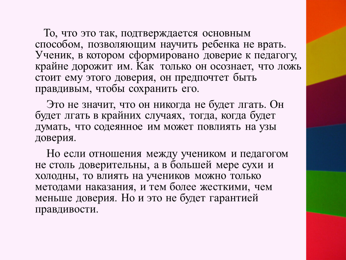 Но если отношения между учеником и педагогом не столь доверительны, а в большей мере сухи и холодны, то влиять на учеников можно только методами наказания, и тем более жесткими, чем меньше доверия. Но и это не будет гарантией правдивости.