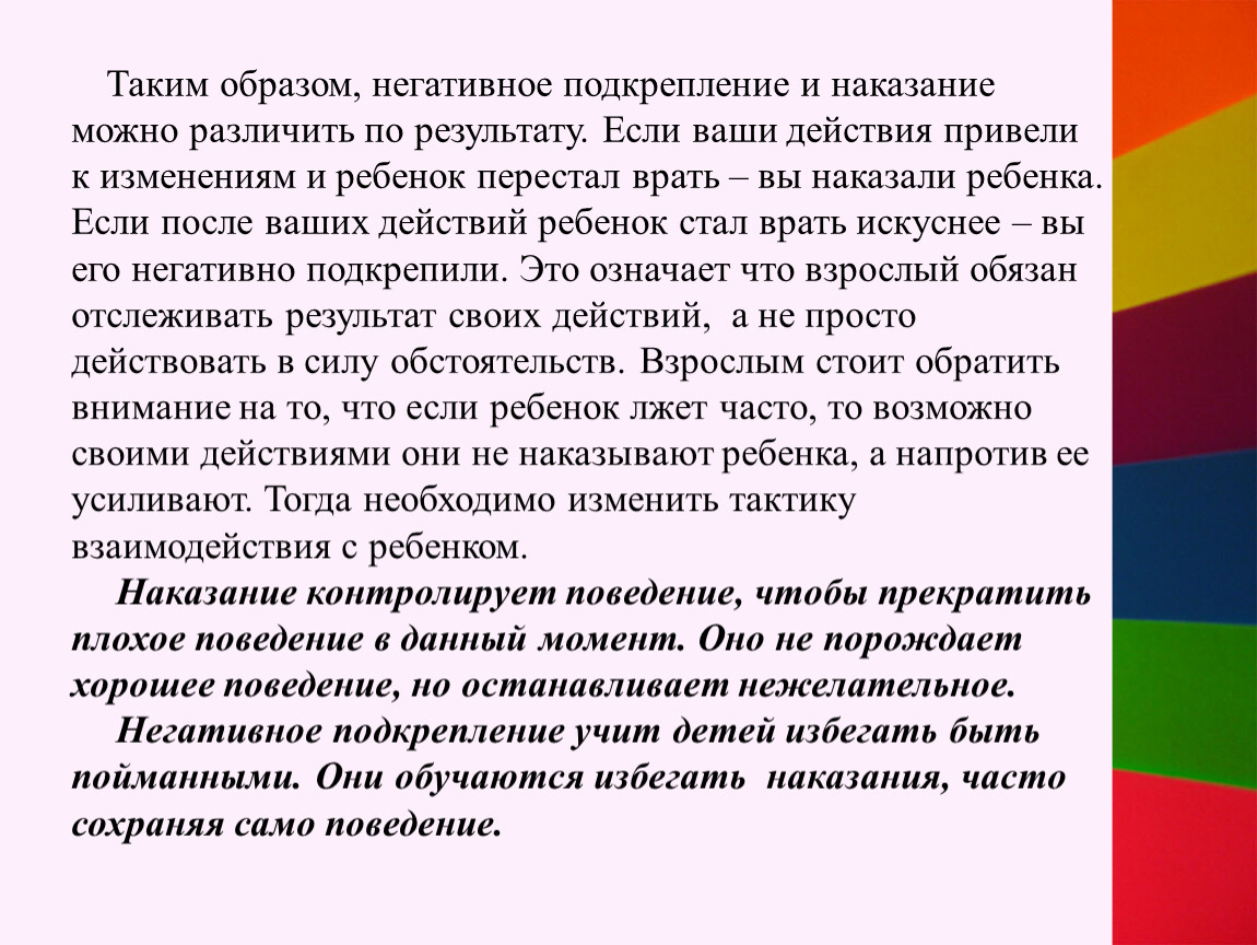 Таким образом, негативное подкрепление и наказание можно различить по результату. Если ваши действия привели к изменениям и ребенок перестал врать – вы наказали ребенка. Если после ваших действий ребенок стал врать искуснее – вы его негативно подкрепили. Это означает что взрослый обязан отслеживать результат своих действий, а не просто действовать в силу обстоятельств. Взрослым стоит обратить внимание на то, что если ребенок лжет часто, то возможно своими действиями они не наказывают ребенка, а напротив ее усиливают. Тогда необходимо изменить тактику взаимодействия с ребенком.