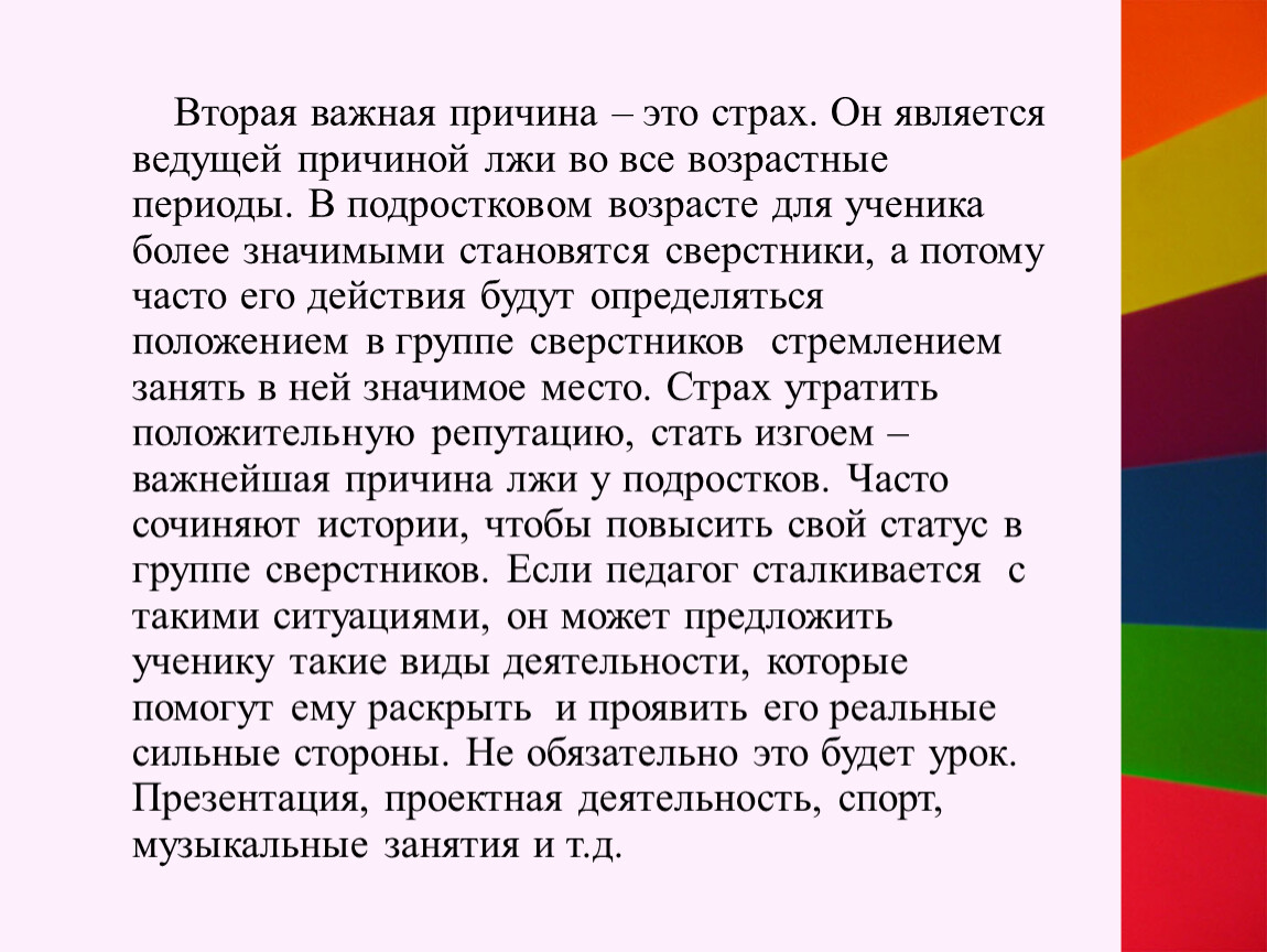 Вторая важная причина – это страх. Он является ведущей причиной лжи во все возрастные периоды. В подростковом возрасте для ученика более значимыми становятся сверстники, а потому часто его действия будут определяться положением в группе сверстников стремлением занять в ней значимое место. Страх утратить положительную репутацию, стать изгоем – важнейшая причина лжи у подростков. Часто сочиняют истории, чтобы повысить свой статус в группе сверстников. Если педагог сталкивается с такими ситуациями, он может предложить ученику такие виды деятельности, которые помогут ему раскрыть и проявить его реальные сильные стороны. Не обязательно это будет урок. Презентация, проектная деятельность, спорт, музыкальные занятия и т.д.