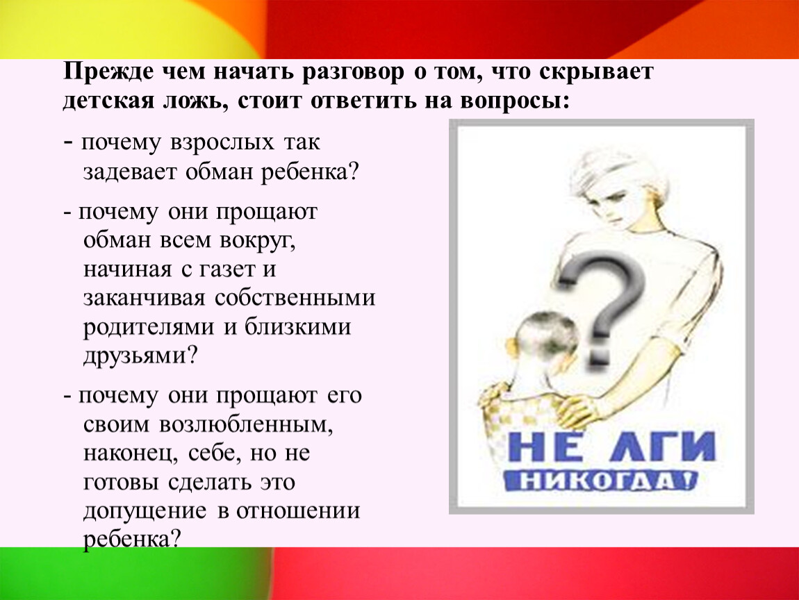 Каждого взрослого задевает ложь только по отношению к нему лично в определенный момент. Они хотят, чтобы ребенок как и взрослый, соотносил лова с контекстом в котором они произносятся. Не этому ли