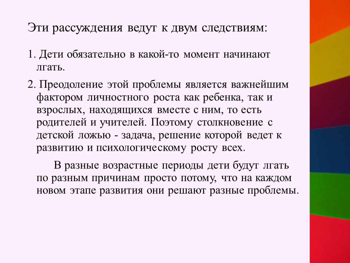 2. Преодоление этой проблемы является важнейшим фактором личностного роста как ребенка, так и взрослых, находящихся вместе с ним, то есть родителей и учителей. Поэтому столкновение с детской ложью - задача, решение которой ведет к развитию и психологическому росту всех.
