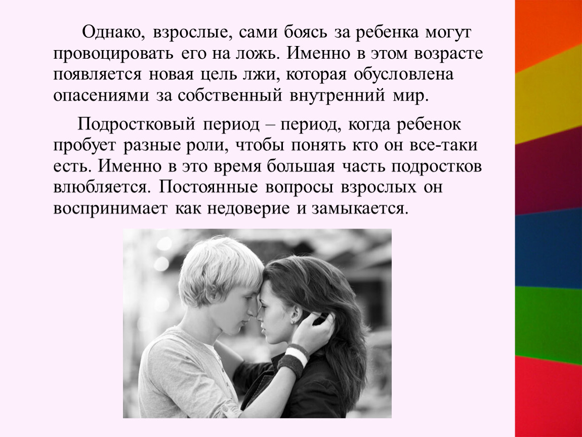 С возрастом человек все более понимает ценность доверия, может лучше прогнозировать результаты своих поступков, а поэтому ложь подростка в большей степени отражает неблагополучие в семье или в отношениях между учителем и учеником, чем в младшем школьном возрасте.
