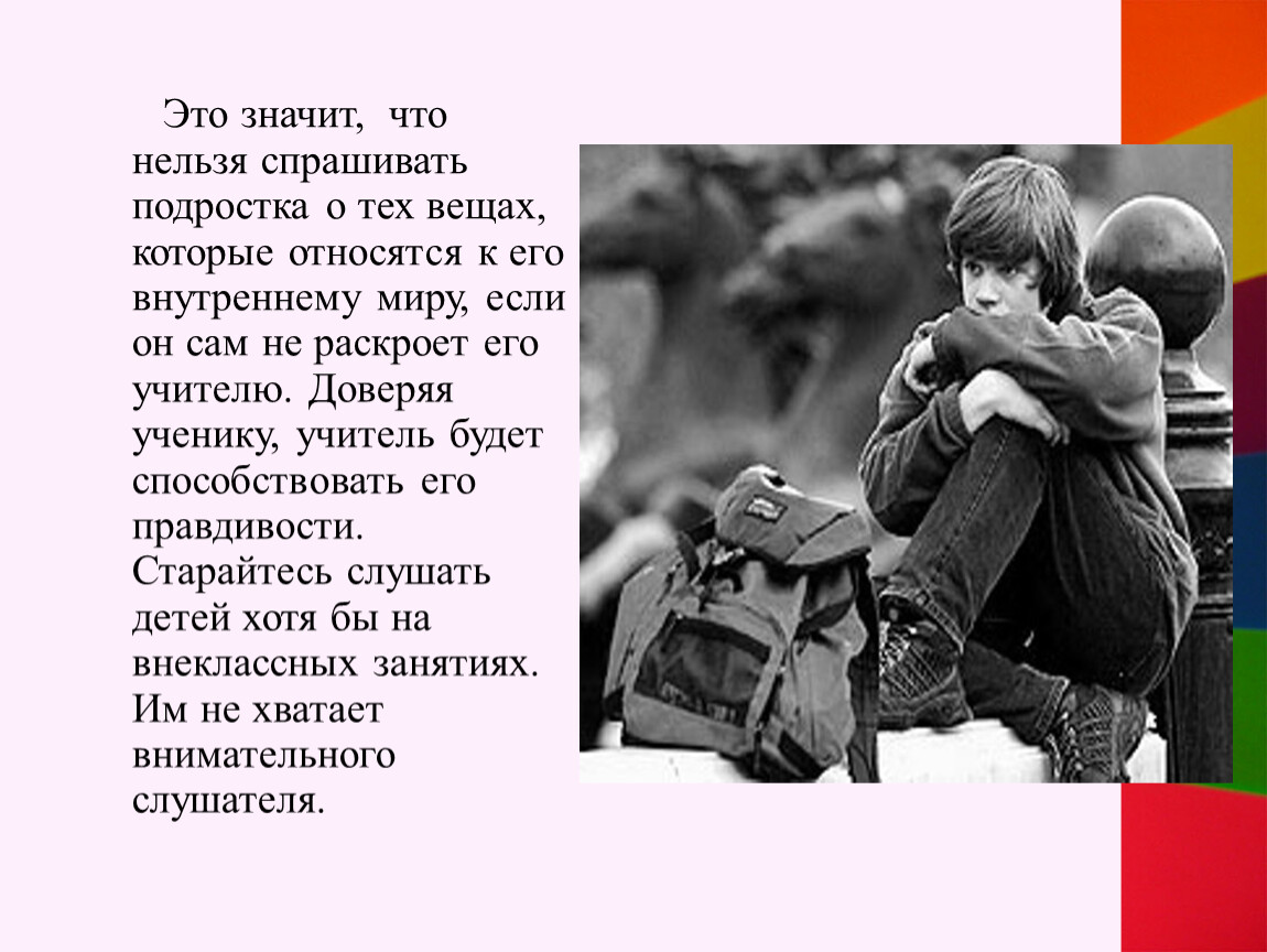 Это значит, что нельзя спрашивать подростка о тех вещах, которые относятся к его внутреннему миру, если он сам не раскроет его учителю. Доверяя ученику, учитель будет способствовать его правдивости. Старайтесь слушать детей хотя бы на внеклассных занятиях. Им не хватает внимательного слушателя.