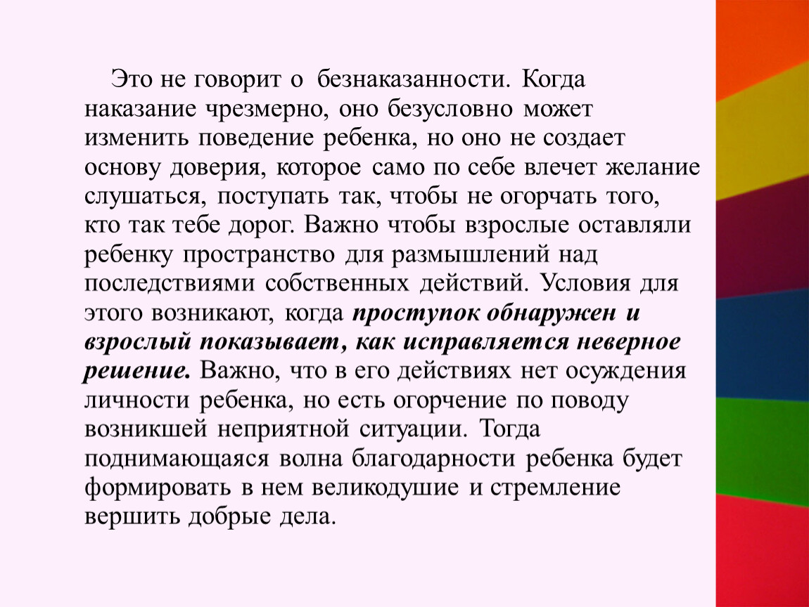 Это не говорит о безнаказанности. Когда наказание чрезмерно, оно безусловно может изменить поведение ребенка, но оно не создает основу доверия, которое само по себе влечет желание слушаться, поступать так, чтобы не огорчать того, кто так тебе дорог. Важно чтобы взрослые оставляли ребенку пространство для размышлений над последствиями собственных действий. Условия для этого возникают, когда проступок обнаружен и взрослый показывает, как исправляется неверное решение. Важно, что в его действиях нет осуждения личности ребенка, но есть огорчение по поводу возникшей неприятной ситуации. Тогда поднимающаяся волна благодарности ребенка будет формировать в нем великодушие и стремление вершить добрые дела.