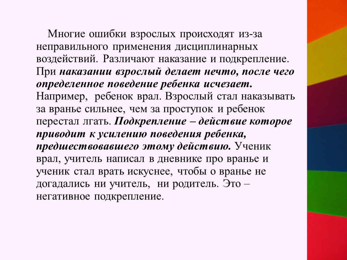 Многие ошибки взрослых происходят из-за неправильного применения дисциплинарных воздействий. Различают наказание и подкрепление. При наказании взрослый делает нечто, после чего определенное поведение ребенка исчезает. Например, ребенок врал. Взрослый стал наказывать за вранье сильнее, чем за проступок и ребенок перестал лгать. Подкрепление – действие которое приводит к усилению поведения ребенка, предшествовавшего этому действию. Ученик врал, учитель написал в дневнике про вранье и ученик стал врать искуснее, чтобы о вранье не догадались ни учитель, ни родитель. Это – негативное подкрепление.