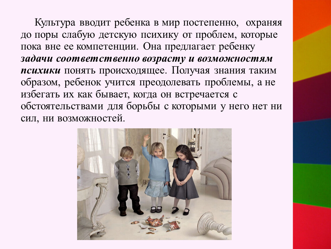 Культура вводит ребенка в мир постепенно, охраняя до поры слабую детскую психику от проблем, которые пока вне ее компетенции. Она предлагает ребенку задачи соответственно возрасту и возможностям психики понять происходящее. Получая знания таким образом, ребенок учится преодолевать проблемы, а не избегать их как бывает, когда он встречается с обстоятельствами для борьбы с которыми у него нет ни сил, ни возможностей.