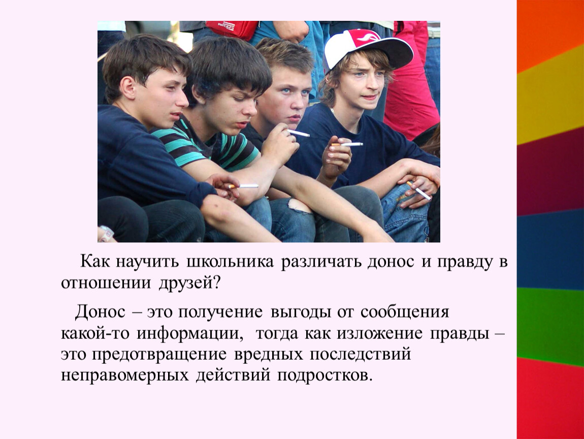 Донос – это получение выгоды от сообщения какой-то информации, тогда как изложение правды – это предотвращение вредных последствий неправомерных действий подростков.