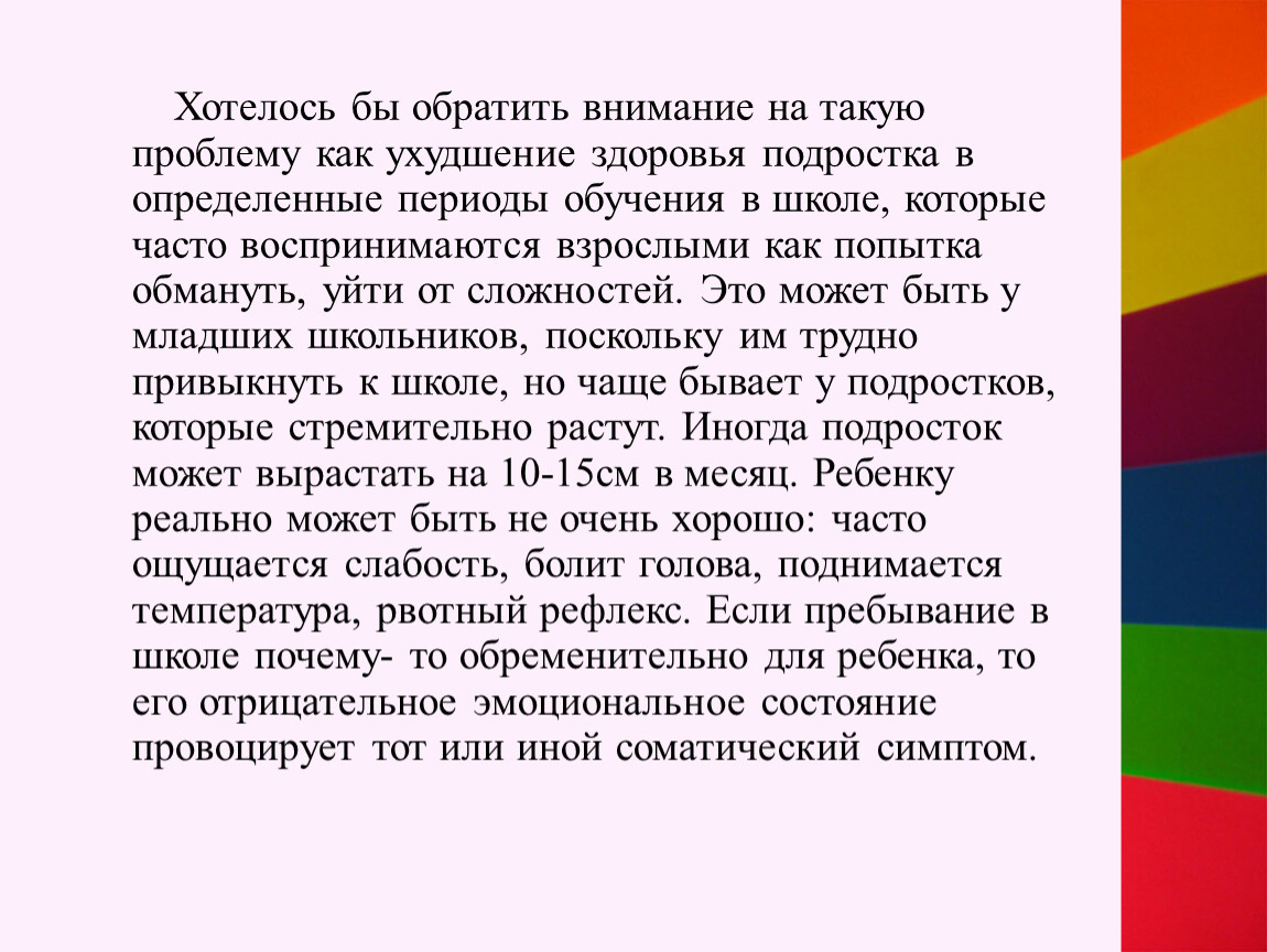Хотелось бы обратить внимание на такую проблему как ухудшение здоровья подростка в определенные периоды обучения в школе, которые часто воспринимаются взрослыми как попытка обмануть, уйти от сложностей. Это может быть у младших школьников, поскольку им трудно привыкнуть к школе, но чаще бывает у подростков, которые стремительно растут. Иногда подросток может вырастать на 10-15см в месяц. Ребенку реально может быть не очень хорошо: часто ощущается слабость, болит голова, поднимается температура, рвотный рефлекс. Если пребывание в школе почему- то обременительно для ребенка, то его отрицательное эмоциональное состояние провоцирует тот или иной соматический симптом.