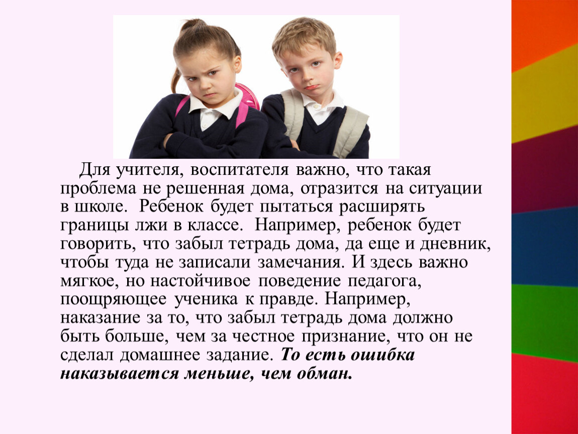 Для учителя, воспитателя важно, что такая проблема не решенная дома, отразится на ситуации в школе. Ребенок будет пытаться расширять границы лжи в классе. Например, ребенок будет говорить, что забыл тетрадь дома, да еще и дневник, чтобы туда не записали замечания. И здесь важно мягкое, но настойчивое поведение педагога, поощряющее ученика к правде. Например, наказание за то, что забыл тетрадь дома должно быть больше, чем за честное признание, что он не сделал домашнее задание. То есть ошибка наказывается меньше, чем обман.