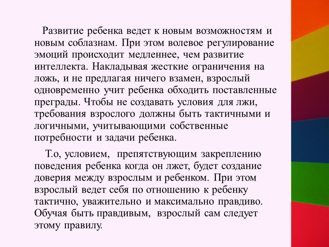 Развитие ребенка ведет к новым возможностям и новым соблазнам. При этом волевое регулирование эмоций происходит медленнее, чем развитие интеллекта. Накладывая жесткие ограничения на ложь, и не предлагая ничего взамен, взрослый одновременно учит ребенка обходить поставленные преграды. Чтобы не создавать условия для лжи, требования взрослого должны быть тактичными и логичными, учитывающими собственные потребности и задачи ребенка.