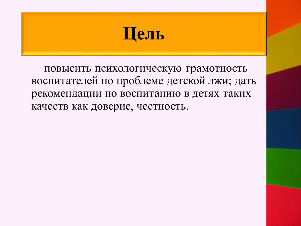 повысить психологическую грамотность воспитателей по проблеме детской лжи; дать рекомендации по воспитанию в детях таких качеств как доверие, честность.