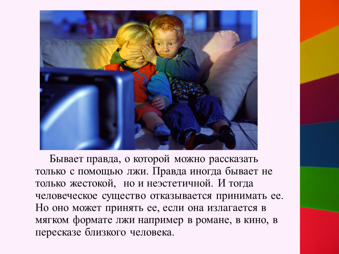 Бывает правда, о которой можно рассказать только с помощью лжи. Правда иногда бывает не только жестокой, но и неэстетичной. И тогда человеческое существо отказывается принимать ее. Но оно может принять ее, если она излагается в мягком формате лжи например в романе, в кино, в пересказе близкого человека.
