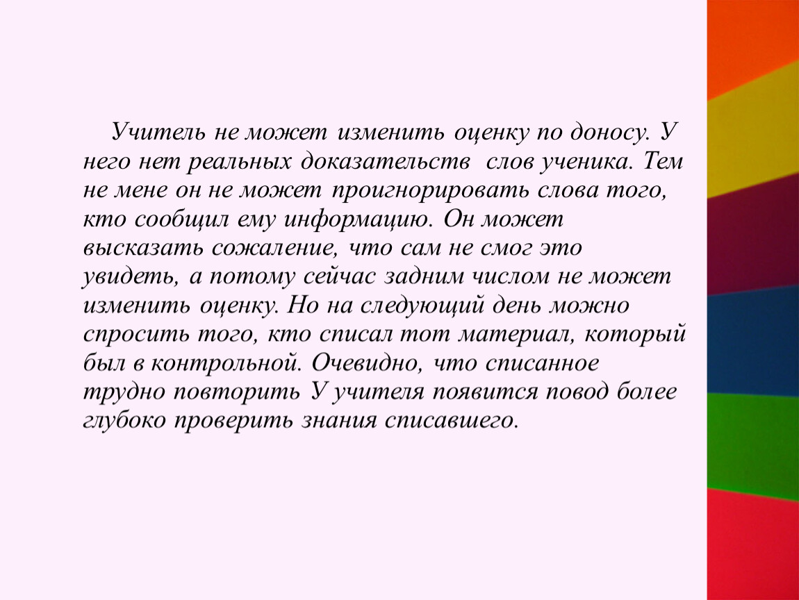 Учитель не может изменить оценку по доносу. У него нет реальных доказательств слов ученика. Тем не мене он не может проигнорировать слова того, кто сообщил ему информацию. Он может высказать сожаление, что сам не смог это увидеть, а потому сейчас задним числом не может изменить оценку. Но на следующий день можно спросить того, кто списал тот материал, который был в контрольной. Очевидно, что списанное трудно повторить У учителя появится повод более глубоко проверить знания списавшего.